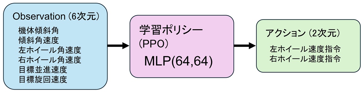 観測 (入力):6次元(機体傾斜角、傾斜角速度、左ホイール速度、右ホイール速度、目標並進速度、目標旋回速度)